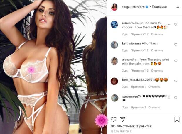 Эби нравится, когда на ее образы обращают внимание, поэтому в основном профиле в социальной сети она показывает только самые необычные и смелые образы. Так, девушка показала смелый образ в белых кружевах, которые примеряла в рамках очередной рекламы для популярного бренда нижнего белья для женщин. Тонкая белая ткань едва прикрыла достоинства, впрочем некоторые части тела Эби скрывать не стала вообще. В зеркале модель смело показала ягодицы, отражение которых удачно оказалось в кадре. Привычно распущенные длинные локоны, небольшие украшения и яркий макияж идеально завершили пикантный образ Рэтчфорд, по поводу которого фанаты написали самые разные комплименты: «Углы