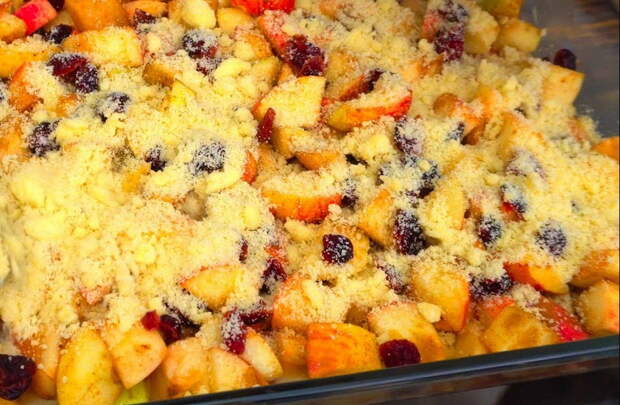 Ингредиенты: 800 г яблок 50 г сахара лимонный сок 1 ч. л. корицы сушеная клюква или изюм по желанию Хрустящая крошка: 150 г сливочного масла 100 г сахара 200 г просеянной муки [caption id="attachment_61204" align="aligncenter" width="1000"] Яблоки подойдут любые. Если очень сладкие, то добавляйте меньше сахара, чем указано в рецепте[/caption]Приготовление (ВИДЕОРЕЦЕПТ): Яблоки нарезать кубиками среднего размера.