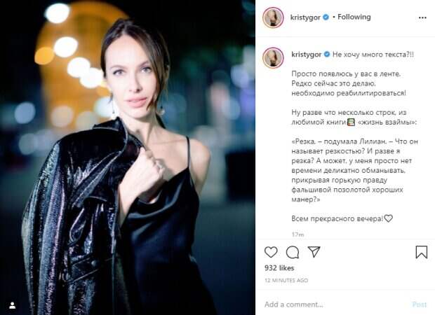 Красотка запечатлена на фоне ночного города в шелковом черном платье, под которым определенно нет бюстгальтера. Она накинула одной рукой на плечо лоснящуюся куртку, а свободную спрятала за спиной. Образ Кристины Горняк дополнила прическа с элегантной челкой. "Не хочу много текста?!! Просто появлюсь у вас в ленте. Редко сейчас это делаю, необходимо реабилитироваться! Ну разве что несколько строк, из любимой книги