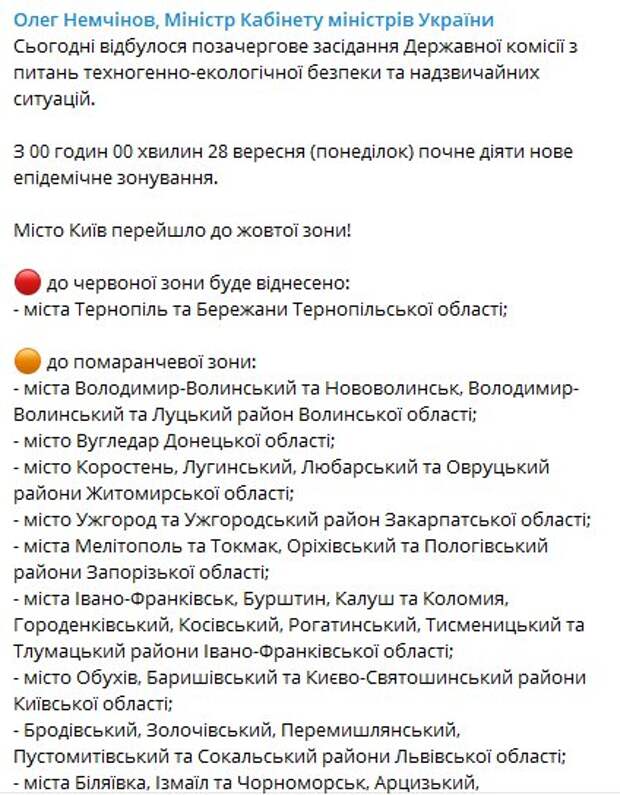 Теперь здесь будут дополнительные ограничения, запрещены: посадка пассажиров в транспорт пригородного, междугородного, внутриобластного и межобластного сообщения; работа кафе и ресторанов, кинотеатров; посещение получателями социальных или реабилитационных услуг учреждений и заведений, предоставляющих эти услуги. В "оранжевой" зоне оказались следующие населенные пункты (Киев перешел в "желтую" зону): В "желтой" зоне теперь находятся: Отметим, в "желтой" зоне действуют такие правила: заведения общепита (кафе, рестораны, бары и т.п.), ночные и другие развлекательные заведения будут работать до 00:00. Ограниченный график работы не коснется заказов "на вынос" и доставки; массовые мероприятия в помещениях проводить можно с расчетом до 20 человек; можно посещать учреждения соцзащиты, где живут пожилые люди. При этом следует помнить и об основных правилах, касающихся всех зон: в помещениях, общественном транспорте, заведениях и прочих общественных местах нужно носить защитную маску; на улице нужно находиться с документом, удостоверяющем личность; при необходимости соблюдать самоизоляцию или находиться на обсервации; въезд иностранцам на территорию Украины запрещен, за исключением некоторых случаев. Ранее мы сообщали, с 28 сентября должен прекратить действовать запрет на въезд в Украину для иностранных граждан. Напомним, лекарства в Украине будут продавать по-новому, важное разъяснение Минздрава Как сообщала Politeka, Кличко рассказал, будут ли работать школы и детсады с 1 октября: "На самоизоляцию..." Также Politeka писала, что будет ли введен в Украине полный карантин: Виктор Ляшко назвал условия