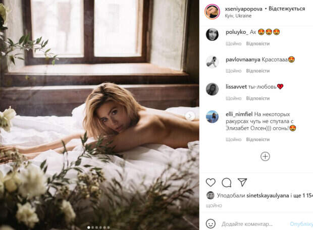Особого шарма фото придали цветы у изголовья кровати. Эффектная блондинка не постеснялась полностью раздеться. Свой бюст она прикрыла ногами, но кое-что поклонникам все таки удалось разглядеть. Стоит отметить, что фотографии получились весьма откровенными. Попова с легкостью могла бы попасть на обложку мужского журнала. В комментариях молодой звезде, которая лишь недавно попала в ВИА Гру, оставили массу восторженных отзывов. «Ксю волшебная», «Красиво как», «Моя самая красивая», «Шикарно, настоящая ВИА Гра. Жду такого плана фотосессию группы», «Какая красивая съемка», «Вау! Какая нежность», «На некоторых ракурсах чуть не спутала с Элизабет Олсен))) огонь!», «какие же фото красивые», «Ксюша, огонь», - пишут пользователи сети. Напомним, что звезда "Х-фактора" Ксения Попова потянула за веревочки топа, показав бюст во весь экран: "Опять играем...". Как сообщала Politeka, молодые красотки из новой "ВИА Гры" заставили глотать слюнки, пошалив в кожаных мини: "Это было прекрасно". Также Politeka писала, что звезда "Х-фактора" и новой "ВИА Гры" завлекла подтянутым "орешком" в красном: "Девушка-загадка".