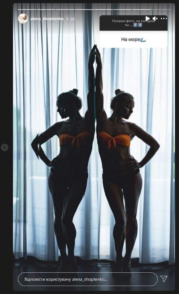 Об этом пишет Politeka.net со ссылкой на страничку знаменитости. "Покажи фото, на котором ты на море", - предложил один из фанатов. Звезда в ответ на это опубликовала фото. Хотя и немного странно, что девушка не показала себя на пляже. Фанаты не ставили лайки и не писали комментарии, так как снимок был размещен в сторис Инстаграм, но обычно Алене пишут много комплиментов: "Мне кажется, у меня по жизни образ оленя", "Буду уставшим человеком после работы", "Шикарные ноги Алена", "Невероятно красивая Алена!!!". Мы сообщали, что украинский хореограф Алена Шоптенко решила освоить новый стиль вместе с финалисткой шоу "Танці з зірками" Юлией Саниной. В своем микроблоге "Инстаграм" она сообщила о начале развивающего челленджа. Алена Шоптенко также выложила селфи с солисткой группы The Hardkiss Юлией Саниной и своей коллегой Владой Касинец. Напомним, Шоптенко из "Танців з зірками" сразила наповал снимком с подросшим сыном А еще Politeka писала, что скромница Санина заставила блондинку из «Танців з зірками» неприлично повилять бедрами Также Politeka сообщала, что Алена Шоптенко из "Танців з зірками" после признаний Дикусара выплеснула свою силу и запал
