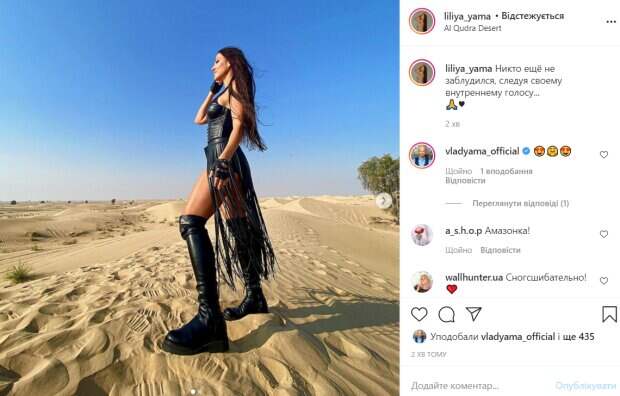 На ногах у нее красовались кожаный ботфорты. Выглядела девушка просто сногшибательно. Фотосессия проходила посреди пустыни. На одном из фото она уселась на песок и устроила жаркие игры. «Никто ещё не заблудился, следуя своему внутреннему голосу», - подписала фото женщина. За короткое время пост Лилии собрал массу комплиментов. «Любви и тепла», «Какая красота безумная обе фото. Ваша красота Невероятно красивая просто Вау браво», «ZENA», «Прям Ксена))», «Во всех вы душенька нарядах хороша!», «Амазонка», «Сногсшибательно!», - пишут пользователи сети. Как известно, Лилия и Влад Яма поженились в 2015 году. Пара воспитывает сына Леона. Ранее мы писали, что Влад Яма едва не лишился семейного счастья из-за поклонниц. Артист признался, что не спешил заключать брак с Лилией, хоть они и встречались до свадьбы 7 лет. Он боялся, что женатый будет не так интересен поклонницам. Напомним, что Влад Яма показал, как травмировался на "Танцях з зірками", видео инцидента с Саниной. Как сообщала Politeka, Влад Яма показал безумные развлечения до травмы на «Танці з зірками»: «Шлем и полный газ!». Также Politeka писала, что страстная жена Ямы в мини-шортах показала, как не дает мужу расслабляться: «Бомба!