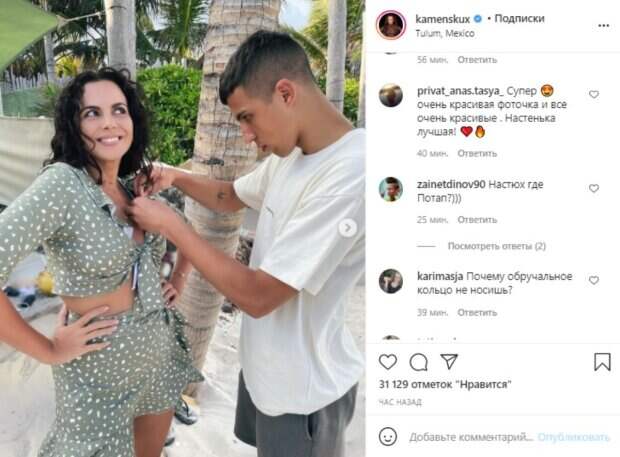 Артистка настолько загорелась идеей женской солидарности, что Потап оказался удачно "забыт" дома. Настя решила показать закулисье съемочного процесса. На кадрах довольная девушка позировала в кокетливом костюмчике болотного оттенка, состоящем из топика и юбки. От ее аппетитного загорелого декольте невозможно отвести взгляд. Впрочем, поведение юного мексиканца, засветившегося с ней на кадрах, это только доказывает. Молодой человек что-то увлеченно цеплял Насте на воротник, положив руки практически ей на бюст. Певица в это время бесстыже улыбалась, отведя взгляд в сторону. Пользователи кинулись с жаром комментировать увиденное: "Где кольцо?