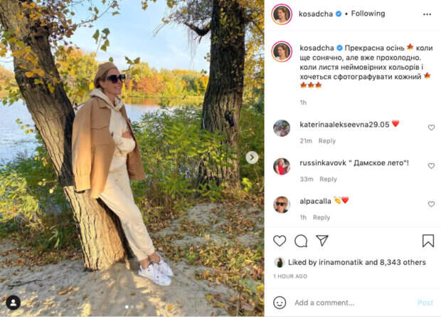 В том же году у них родился сын Иван, а месяц назад Осадчая родила ему второго сына - Даниила. Так, на этот раз телеведущая опубликовала новую серию фото на своей странице в Инстаграм. Катя Осадчая прогулялась в стильном образе возле речки. На ней бежевого оттенка рубашка-пальто, которое надето на стильный спортивный костюм молочного цвета из толстовки и штанов. Свой образ она дополнила белыми кроссовками и бежевым беретом. "Прекрасная осень