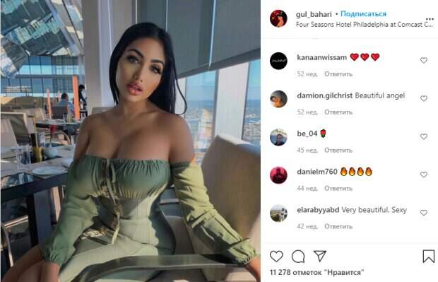 Чтобы не переходить грань откровенности, Бахари подчеркивает лишь свою грудь и не скрывает ее под кофточками. В платье темно-болотного оттенка ей удалось показать не только бюст, но еще и довольно изящную талию с пышными бедрами. Спущенные с плеч рукава придали брюнетка чуть более пикантный вид. «Красивый ангел; Очень красивый. Роскошный образ; Очень красивый наряд, который ты почти носишь. Мне нравится этот зеленый цвет, и материал выглядит очень мягким, как и вы ........