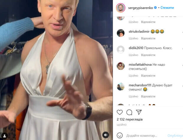 Когда Писаренко заметил, что его снимают, он начал оправдываться, обращаясь к поклонникам. Он отметил, что это просто роль, которую он сыграет 8 марта. Актер призвал фанатов не начинать наговаривать на него. «Просто роль..», - подписал видео Писаренко. В комментариях позитивно отреагировали на образ актера и оставили ему массу приятных отзывов. «Зачет», «Прикольно. Класс», «Не надо стесняться))», «Теперь понятно для чего худел», «Думаю будет смешно!», «Вау, а ветерок снизу будет?», «Сергей, невероятно талантливый человек», «Мэрилин Монро однако, не дать не взять», «Фигура огонь», - пишут пользователи сети. Отметим, что 52-летний Сергей Писаренко родом из России. Он стал широко известен, когда выступал в команде КВН «Уездный город». Показательно, что Писаренко один из немногих артистов, которым удается работать на две страны. В России Писаренко работает доцентом Московского Государственного института культуры искусств. Напомним, что Крутоголов из "Dizel show" похвастался подросшим сыном, которого долго не показывал: "Какой жених...". Как сообщала Politeka, Булитко из "Дизель шоу" кардинально сменила внешность, невозможно узнать: "Люблю, когда дорого". Также Politeka писала, что Крутоголов из "Дизель Шоу" выдал позорную правду о "Квартал 95", началась травля: "Потерял много друзей и. ..".