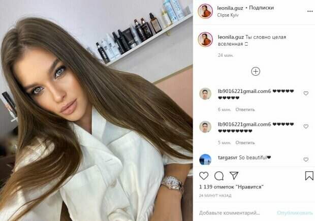 Длинное украшение на шее придало акцента столь откровенному образу. Модель засветила часть пышной груди и плоский животик. Виды просто поражали красотой. Звезда также была в длинной юбке, которая прикрыла ее длинные стройные ножки. Фотограф вел съемку снизу, из-за чего формы Гузь выглядели еще соблазнительнее. Также на другом фото модель показали в полный рост. Леонила позировала в красивом зале элитного отеля, пристально глядя в камеру. От ее красоты нельзя оторваться. За полчаса пост собрал 500 лайков и немного комментариев, в основном, в виде смайликов. Напомним, Леонила Гузь продемонстрировала всю свою красоту. Так, модель позировала в белой рубашке, от чего ее вид казался нарядным. На руке красотки блестели часы. Волосы звезда красиво уложила, они легли ровной волной. Макияж подчеркнул форму глаз Леонилы, поэтому в них нельзя было перестать смотреть. Ранее мы писали, что Леонила Гузь сделала селфи, на котором запечатлела свое лицо крупным планом. Свободную руку красотка запустила в свои распущенные волосы, а ее томный взгляд, кажется, может приворожить даже через фотографию. Из одежды на знаменитости можно заметить только белую толстовку. Напомним, Мисс Украина Леонила Гузь без стыда расставила ноги в облегающем боди А еще Politeka писала, что горячая Мисс Украина в одном лишь в кружеве похвасталась утонченными линиями Также Politeka сообщала, что Мисс Украина Леонила Гузь показала безупречные формы в томной позе