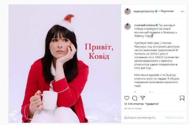 "Привет, вирус", - написано на фото Маши. "Так выглядит победа в конкурсе на самый конченный подарок к Николаю и Новому Году. Чувствую себя (хре...) сносно. Нахожусь под контролем докторов, честно выполняю предписания! И пытаюсь не сойти с ума от осознания того, КАКОЕ количество запланированного и важного отменилось одним ковырянием в носу для пцр... Моя семья здорова и по бырику отселила меня на чердак. В общем, отстойное окончание отстойного года! Берегите себя!", - написала звезда в публикации. Фанаты поставили более 10 тысяч лайков и написали комментарии: "Выздоравливай, Маша", "Машенька, крепись и выздоравливай. Это время для осознания новых творческих планов", "Выздоравливай побыстрей, Машунька! Обнимаю", "Маша, не грустите, все будет хорошо!!! Выздоравливайте поскорее!!)". Мы писали, что популярная украинская певица Оля Полякова устроила безбашенные развлечения с ведущей Машей Ефросининой и известным фотографом Соней Плакидюк. На выходных Полякова позвала к себе звездных подруг, чтобы заняться готовкой и просто хорошо провести время. Как выяснилось, красотки решили наквасить капусты, однако на это не остановились. Напомним, растрепанная Полякова впечатлила внешним видом после пьянки с Ефросининой и Плакидюк Также Politeka писала, что игривая Никитюк покрутила декольте без лифчика перед носом Ефросининой А еще Politeka сообщала, что соблазнительная Ефросинина без лифчика показала, как сильно изменилась