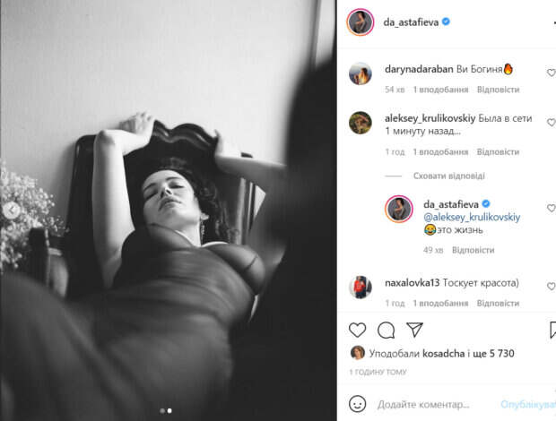Ее красотой даже заинтересовался создатель мужского журнала Хью Хефнер. Сегодня певица уже имеет более сдержанный стиль, чем во времена работы в NikitA. При этом не упускает возможности устроить себе пикантную фотосессию. В этот раз Даша позировала на диванчике. Она была одета в прозрачную ночнушку, через которую все просвещалось. Красотка выбрала весьма выгодную позу, чтобы подразнить своих поклонников. «А оказывается, Том, не такой уже был и плохой) Просто Джерри все выгодно нам преподносил, ребята!», - подписала фото певица. В комментариях ей оставили массу приятных слов и комплиментов. «Это очень сильно красиво», «Это точно. Фото бомба, прям по мою душу такие снимки», «Вы богиня», «Тоскует красота», «Словами не выразить насколько это чувственно и красиво», «Огненный огонь! Прекрасна!», - пишут пользователи сети. Ранее мы писали, что Астафьева поделилась кадрами, сделанными в бассейне. Артистка предпочла обойтись без косметики, показав, что и без макияжа можно выглядеть прекрасно. Напомним, что Астафьева покорила формами в ретро-купальнике, взобравшись на скалы: «Русалки существуют». Как сообщала Politeka, Астафьева втиснула упругие прелести в узкий купальник, заворожив красотой: "Женская сила". Также Politeka писала, что Астафьева без одежды едва прикрыла роскошные формы сухими веточками: "Побольше бы таких фото".
