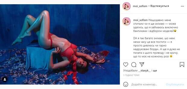 Свои работы Соня часто выкладывает в микроблоге в Instagram. Так недавно она опубликовала жаркий кадр, на котором запечатлела популярную певицу Дашу Астафьеву. Правда, звезду на этом снимке очень сложно узнать. Как видно, снимок был сделан в интересной атмосферной локации в синих тонах, а модель на нем появилась в очень соблазнительном образе и смелой позе. На этом снимке Даша демонстрирует все свои прелести – упругий бюст, плоский животик, бесконечные ноги. А из одежды на ней только страстный красный комплект белья и красная лента, завязанная на шее. Волосы певицы здесь в короткой темной стрижке-каре, а на лице яркий макияж. Выглядит этот кадр очень эффектно и завораживающе, поклонники просто в восторге. В подписи к фотографии Соня Плакидюк рассказала, что у нее много работы, поэму не всегда есть время что-то публиковать в соцсетях. "Недавно меня спросили снимаю ли я еще – может показаться, что я занимаюсь исключительно бантиками и отбором моделей. А я так много снимаю, что мне некогда это все поститься", - признается фотограф. "Поставила напоминание публиковать свои работы – надеюсь, это так же интересно, как мой шпагат и романтические отношения. На фотографии – сами знаете кто", - добавила Соня. Напомним, Плакидюк из «Супер топ-модель по-украински» избавилась от лифчика и комплексов: "А не слишком ли...". Как сообщала Politeka, Озорная Плакидюк из «Супер топ-модель по-украински» покорила игривым образом в ванной: "Прям девчонка". Также Politeka писала, Плакидюк из "Супер топ-модель по-украински" устроила легкие шалости, задрав ножки: "Вспомнила об Алле Пугачевой".