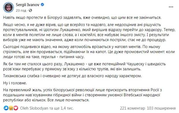 Сейчас у белорусских силовиков, по словам Иванова, полетели уже не только слова, а и коктейли Молотова, и теперь все приобретает другой смысл. "И результаты выборов уже не имеют значения, ведь когда начинаются выстрелы, становится не до процедур", - подчеркнул он. Также журналист рассказал о том, как автомобиль протестующих "таранил" толпу силовиков. "По нему стреляют, но он прорывается, поднимая их на капот. Это очень красноречивый момент: когда люди готовы на такое, герилья - вопрос времени. Как бы там не случилось на этот раз, Лукашенко - это уже потенциальный Чаушеску, и скорость развязки находится в прямой связи с количеством трупов, которые он оставит", - подчеркнул Иванов. Впрочем, как прогнозирует журналист, успех белорусской революции может потянуть за собой и российское вторжение. "К величайшему сожалению, успех белорусской революции лишь ускорит вторжение России с последующим навязыванием гибридной войны и созданием условной Витебской народной республики или нескольких. Все только начинается", - отметил он. Напомним, Майдан Беларусь захлестнул с новой силой, ОМОН набросился даже на журналистов: "В ход идет все...". Как сообщала Politeka, над Беларусью нависла новая угроза: "Северная Корея в центре Европы". Также Politeka писала, что Лукашенко возмутил жалобой на "майданутих" украинцев: "За деньги и мать родную продадут".