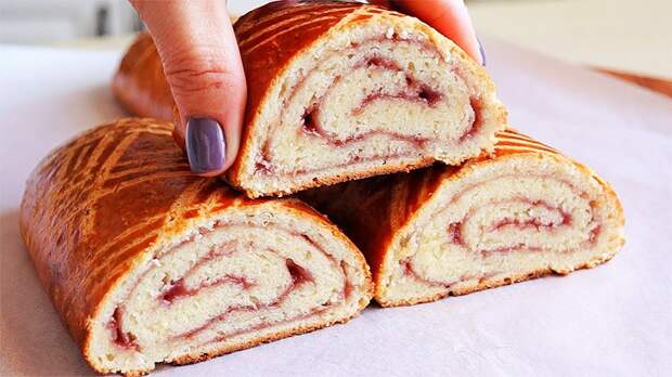Добавляем муку, разрыхлитель и замешиваем тесто. Раскатываем тесто в пласт, смазываем джемом, сворачиваем в рулет. Затем нужно переложить на противень и смазать желтком. Чтобы получилась красивая кофейная корочка, добавьте в смесь из желтка и молока растворимое кофе. Также с помощью обычной вилки можно сделать простой узор, как на фото. Выпекаем рулет 35 минут при 180 ℃. На следующий день рулет еще вкуснее становится