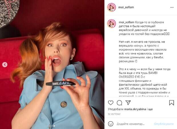 Как видно, на новых фотографиях Соня позирует в красной комнате, она прилегла на мягкий диванчик и снята как будто сверху. Перед камерой красотка появилась в стильном небесно-голубом плаще с пуговицами, а в руках держит любимую тушь. Ее волосы собраны в аккуратный хвост и рассыпаны рядом с головой, а на лице яркий макияж и удивленное выражение, выглядит она весьма забавно, походя на куклу. В подписи к фотографии Плакидюк рассказала о своем детстве и любой туши для ресниц. " Когда-то в глубоком детстве я была настоящей еврейской девочкой и никогда не уходила из гостей без подарков. Нет-нет, я ничего не просила, не верещала «хочу», а просто с искренним восхищением хвалила всё, что мне нравилось, хлопая своими длинными, как у бемби, ресницами. Это я к чему — если бы у меня тогда была еще и эта тушь, то однажды я бы точно ушла с подаренными конём и квартирой, а не банками варенья и сережками", - написала Соня. Напомним, Плакидюк из "Супер топ-модель по-украински" показала кокетливый весенний образ, Астафьева не выдержала: "Быстро сняла...". Как сообщала Politeka, Плакидюк из "Супер топ-модель по-украински" подловила Дашу Астафьеву в тот самый момент: "Бюстгальтер не…". Также Politeka писала, Плакидюк из "Супер топ-модель по-украински" избавилась от лифчика и комплексов: "А не слишком ли. ..".