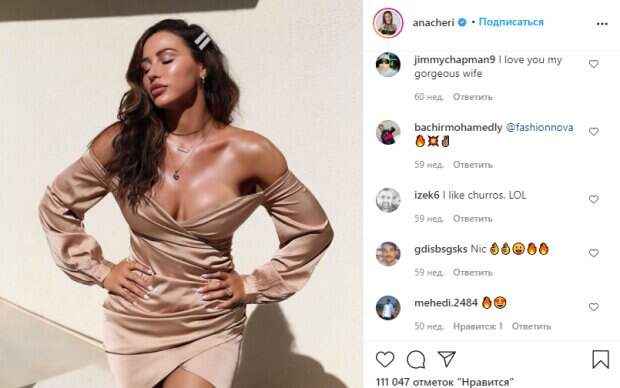 В этот же раз Ана из спортивной фитнес-красотки превратилась в нежную девушку, прогуливающуюся на улице в коротеньком платье из атласа. Бежевый цвет наряда очень выгодно подчеркнул бронзовую кожу Чери. Загорелая модель с измазанным шиммером телом приспустила рукава мини-платья и показала также бюст во всей красе. При этом легкий макияж был совсем незаметным. Вот что пишут в сети по поводу непривычного образа Аны: «Прекрасная принцесса