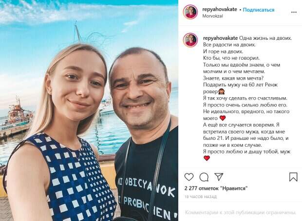 Теперь же девушка окончательно забыла о трауре решила поделиться в Инстаграм новым постом, в котором рассказала о своих отношениях с мужем. Так, она призналась, что мечтает подарить ему роскошную машину. «Знаете, какая моя мечта? Подарить мужу на 60 лет Ренж ровер Я так хочу сделать его счастливым. А ещё все случается вовремя. Я встретила своего мужа, когда мне было 21. И раньше не надо было, и позже ни в коем случае. Я просто люблю и дышу тобой, муж», - написала Репяхова. Свой пост она сопроводила совместной фотографией с Павликом. На ней они оба улыбаются, стоя на фоне моря, и выглядят очень довольными таким отдыхом. Подписчики тут же отреагировали на пост девушки. При этом после предыдущей волны негатива девушка начала чистить комментарии, поэтому среди них остались только хвалебные отзывы. «Очень красивая пара, молодцы», «Катюша, берегите его», «Если бы вас не знала то бы подумала что фото с папой», «Молодцы! Пошлите всех на**ен. Живите и любите!», - пишут люди. Напомним, экс-жена Виктора Павлика показала трогательное фото с ушедшим из жизни сыном: "Пашенька, как ангелочек под твоим крылом" . Как сообщала Politeka, экс-жена Виктора Павлика рассказала, как пережила утрату сына. Также Politeka писала, что экс-жена Виктора Павлика нашла слова после потери сына, это очень сильно.