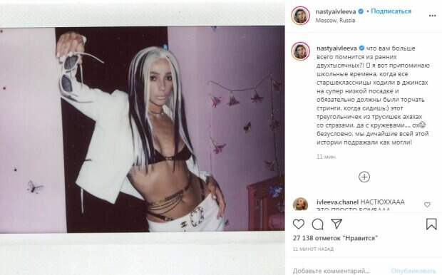 "Что вам больше всего помнится из ранних двухтысячных?! я вот припоминаю школьные времена, когда все старшеклассницы ходили в джинсах на супер низкой посадке и обязательно должны были торчать стринги, когда сидишь этот треугольничек из трусишек ахахах со стразами, да с кружевами.... ох безусловно, мы дичайшие всей этой истории подражали как могли!", - подписала Настя Ивлеева очередную публикацию в своем микроблоге. Пользователи своеобразно отреагировали на новый пост. Кто-то похвалил телеведущую за смелость, а были и такие комментаторы, которые отметили схожесть блогера с популярной певицей Кристиной Агилерой. "Агилера К.нервно курит в стороне! Настя вы красотка и ох**нная ведущая!", "Настюха, это просто бомба", "Я жду с нетерпением низких джинс... и стринги натянуть на уши", "Образ похож на Кристину Агилеру)", "А сейчас говорим,что молодежь совсем отбитая стала. Сами-то чем лучше были?Лифчик под прозрачную сетку,юбка,которой почти не видно и шпилька 10 см", "Божечки, кайф", "Как будто сестра Бузовой", "Кристину Агелеру напомнило", - написали они в комментариях. Напомним, Ивлеева из «Орла и Решки» опозорилась, засветив трусы в откровенном образе А еще Politeka писала, что экс-любовник унизил Ивлееву из "Орла и решки" Также Politeka сообщала, что рыдающая Настя Ивлеева из "Орла и решки" обратилась за помощью