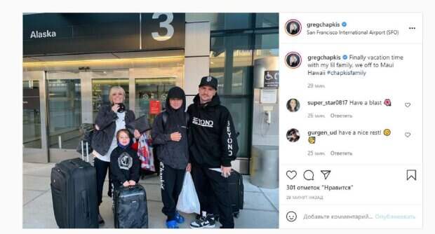 В этот раз Грэг опубликовал фото, на котором позировал у международного аэропорта Сан-Франциско, США. Рядом можно увидеть детей и жена. Как можно понять, семейство собралось в отпуск на Гавайи.  "Наконец-то каникулы с моей маленькой семьей, мы отправляемся на Мауи, Гавайи", - написал Грэг. Фанаты поставили более 300 лайков и написали комментарии: "Удачи", "хорошего отдыха!", "Красивая семья, братан", "Безопасных путешествий, семья !! Наслаждаться!!", "Удачи вам, ребята !!!". Сообщалось, что Грег Чапкис, показал новый снимок на радость фанатов. Последним фото, которое Грег Чапсик обнародовал в своем Instagram-аккаунте стал фотоколлаж, на котором показан любимец семьи совсем щенком и спустя пять лет - уже взрослой собакой. Локацией для него стал особняк с гаражом и двумя припаркованными белыми автомобилями. На Напомним, сын Григория Чапкиса показал, на что способен в свои 42 А еще Politeka сообщала, что американская невестка Чапкиса из "Танців з зірками" показала его подросших внуков Также Politeka писала, что сын Григория Чапкиса раскрыл, сколько ему платят в Америке