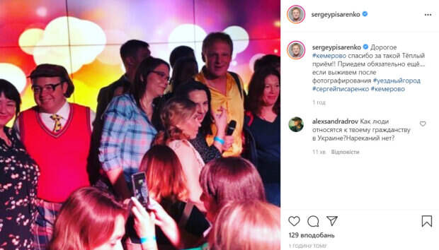 Оба были членами команды «Уездный город». Сегодня артисты умудряются работать на две страны, хотя в сложившейся ситуации без скандалов это удается немногим. Впрочем, с 2011 года звезды преимущественно работают в Украине. У себя в Инстаграм Писаренко поделился фотографией, сделанной после концерта в российском городе. Его окружила толпа поклонниц, которые хотели сфотографироваться со звездой. «Дорогое #Кемерово спасибо за такой теплый прием!! Приедем обязательно ещё... если выживем после фотографирования», - дал обещание российским поклонникам Писаренко. Стоит отметить, что помимо гастрольной деятельности, Писаренко также занимается преподавательской работой в Москве. С 2013 года он является доцентом кафедры Рекламы и PR Московского Государственного института культуры искусств. Ранее мы писали, что Сергей Писаренко поделился забавными кадрами из фотосессии с Никишиным. Напомним, что звезда "Дизель шоу" Писаренко вжился в роль алкоголика, удивив внешним видом: "Три дня назад...". Как сообщала Politeka, звезда "Дизель шоу" Писаренко, покинувший Украину, поразил новым фото: "Пешком через границы". Также Politeka писала, что звезда "Дизель шоу" Писаренко рядом с Никишиным засветил пикантный момент: «Сезон свадеб начался».