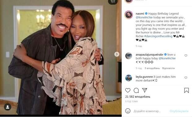 Известная супермодель 90-х Наоми Кэмпбелл показала фото с известным певцом Как пишет Politeka.net, Наоми Кэмпбелл эмоционально поздравила с днем рождения своего давнего друга, знаменитого певца Лайонела Ричи, которому 20 июня исполнилось 72 года. Лайонел Ричи - американский поп-исполнитель, который наряду с Майклом Джексоном и Принсом царил на олимпе мировой поп-музыки в первой половине 1980-х годов.