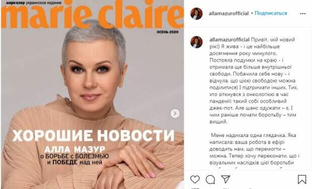 "Меня вдохновляла одна зрительница. Которая написала: ваша работа в эфире доказывает нам, что победить можно. Теперь хочу убедить, что и визуальных последствий этой борьбы особо бояться не стоит. Потому что главное-очистить организм. А волосы-отрастут. И жизнь подбросит вам новый образ: который может оказаться неожиданно симпатичным. Даже модным и актуальным: как оказалось в моем случае", - призналась телеведущая в Instagram. Она также призвала украинцев не бояться перемен и верить в собственные силы. "Не бойтесь перемен. Поверьте в себя и свои силы. Доверьтесь небу: там действительно удивительным образом подсказывают нам путь", - добавила телеведущая в публикации. Поклонники мгновенно отреагировали на пост Аллы Мазур и восхитились ее новой внешностью. "Алла, вы-супер, так держать!", "С днем рождения! Всего наилучшего", " какая вы красивая! Здоров"я вам на многие лета!", "С днем рождения! Будьте счастливы!", "Дай бог здоровья!", "Алочка, вы большая молодец. Здоровье это самое ценное в жизни. Эта болезнь неизвестно от чего возникает и это пугает. А еще пугают цены на лечение. К сожалению люди умирают от того, что нет денег", "Красавица в любом образе!", "Аллочко, вы - непревзойденная! ", "Вы невероятная. Пусть Господь вас оберегает и сопровождает всю вашу жизнь ! Крепкого вам здоровья и многая лета", "Когда тебе импонирует человек, ее мышление, ее манера общения, ее добрые глаза и такая искренняя улыбка, то любые фото прекрыть сне. Я благодарю вас за Вашу силу перед трудностями, спасибо Вам за Вашу победу", "Как идет такая стрижка. Классная, молодая!" - написали они в комментариях под публикацией. Напомним, Алла Мазур, победившая рак, произвела фурор снимком из отпуска. Как сообщала Politeka, сын Аллы Мазур кардинально изменил внешность. Также Politeka писала, что Алла Мазур после победы над раком показала свою новую гордость и удивила внешностью.