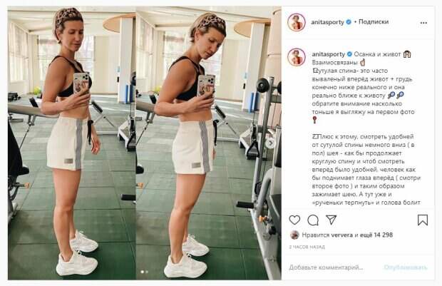 Об этом пишет Politeka.net со ссылкой на страничку знаменитости. "Осанка и живот - Взаимосвязаны. Сутулая спина - это часто вываленый вперёд живот + грудь конечно ниже реального и она реально ближе к животу. Обратите внимание насколько тоньше я выгляжу на первом фото", - написала Луценко под фото. Фанаты, включая Брежневу, поставили более 14 тысяч лайков и написали комментарии: "Думаю многие из нас с осанкой как на фото #2 в жизни и как на #1 для фото", "Рекомендую", "Благодарим! Мне кажется, что осанка - это половина тех проблем, с которыми люди приходят в спортзал, просто им этого никто не объясняет(", "Уже давно стараюсь спину ровно держать)". Сообщалось, 36-летняя украинская спортсменка, главный тренер шоу "Зважені та щасливі", Анита Луценко, показала, благодаря чему обладает стройным и подкаченным телом. При этом звезда позировала в короткой розовой футболке и черных спортивных штанах. На ногах Аниты - белоснежные кроссовки. Кадры вышли очень познавательными. Напмним, тренер "Зважені та щасливі" Анита Луценко соблазнительно выгнулась в тесных лосинах А еще Politeka писала, что тренер "Зважені та щасливі" Анита Луценко задрала платье, засветив лишнее во время свидания Также Politeka сообщала, что тренер "Зважені та щасливі" Анита Луценко рассказала секрет упругого бюста