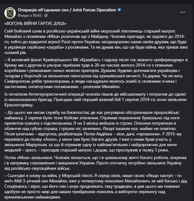 "Нас регулярно обстреливали пророссийские наемники. 2 августа было тесное боевое столкновение. Получил ранение: буквально под ноги прилетела граната из подствольника. Я на 3 месяца вышел из строя. Осколки попали в лицо над губой справа, и чуточку нос задело", - вспоминает воин. Врачам удалось его спасти и спустя некоторые время он вернулся в строй "В 2015-м перевелся в полк «Азов», у меня там было много друзей. И уже с ними участвовал в освобождении Мариуполя, за что и получил одну из самых памятных и дорогих для меня медалей – крест", - поделился украинец. "Сегодня я снова на войне, в морской пехоте. Я среди своих, наш лозунг: "если наступление – то мы!", - заявил Михаил. Напомним, ВСУ показали боевую мощь страны на учениях с НАТО, появилось впечатляющее видео. Как сообщала Politeka, украинские защитники поженились прямо на передовой, трогательные фото. Также Politeka писала, что отряд полицейских вернулся после боев на Донбассе, трогательные кадры.