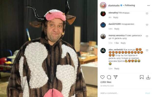 Актер "Дизель Шоу" Егор Крутоголов порадовал поклонников ярким новогодним образом Как пишет Politeka.net, в социальной сети "Инстаграм" появилось фото знаменитости в праздничном костюме, он примерил на себя роль быка - символа 2021 года по восточному календарю. Для новогоднего выпуска Егор Крутоголов надел костюм рогатого животного на молнии, оставив лицо открытым.