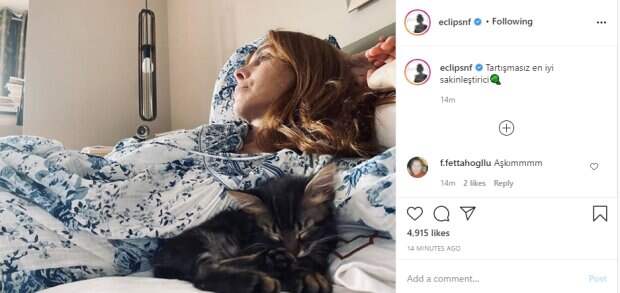 Нур разлеглась на кровати и с усталым видом уставилась в потолок. У нее под боком примостился пушистый серый котенок, который свернулся калачиком и задремал. Видимо, ему очень комфортно рядом со знаменитой хозяйкой. "Пожалуй, лучшее успокоительное", - так актриса охарактеризовала своего четверолапого друга. Пользователи социальной сети оценили внешний вид Феттахоглу и ее трогательными отношениями с котиком в комментариях: "Пожалуй, самая милая женщина «нур»
