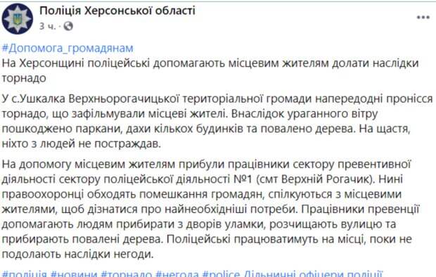 Погодное ЧП всколыхнуло украинцев, последствия которого до сих пор разгребают В Херсонской области пронесся мощный торнадо. Полицейские помогают местному населению ликвидировать последствия стихии. Об этом сообщает пресс-служба полиции области. Уточняется, что в селе Ушкалка Верхнерогачицкой территориальной громады накануне произошел торнадо.
