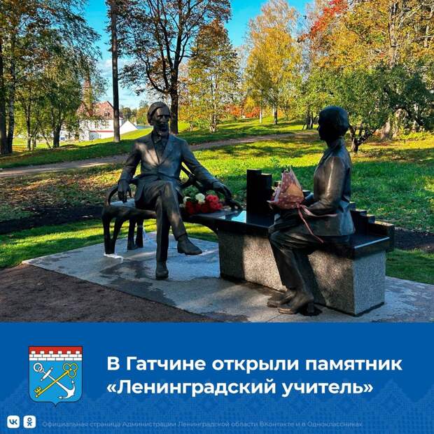 Памятник «Ленинградский учитель», выполненный по проекту скульптора Арутюна Акобяна, появился в Приоратском парке Гатчины, сообщает пресс-служба правительства Ленинградскойобласти 6 октября на официальном интернет-портале. Открытие памятника приурочено ко Дню учителя. Проект был выбран жителями Гатчины и профессиональным сообществом осенью 2022 года на конкурсе проектов скульптурной композиции, посвященной Ленинградскому учителю.