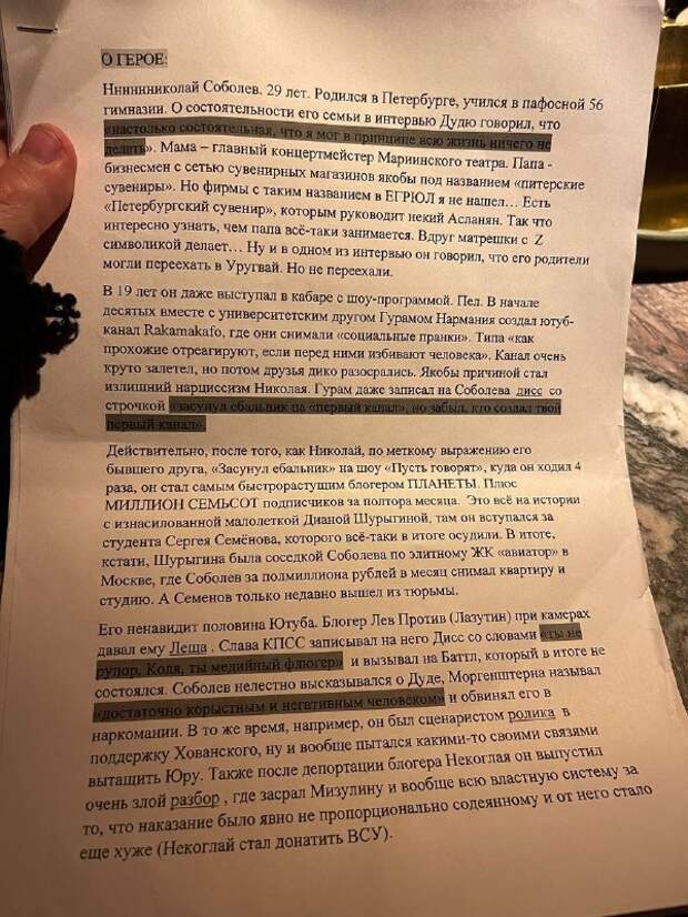 Герой нового выпуска интервью с Ксенией Собчак, блогер Николай Соболев* сообщил, что журналистка после беседы забыла у него дома несколько листов с вопросами. Их фотографии звезда YouTube обнародовал в своем Telegram-канале. «Рискну предположить, что так выглядит подготовка к любому интервью – редактура набрасывает токсичный план с характеристикой героя, где все хайповые хайлайты и противоречия описываются в намеренно дурном пересказе, с сохранением всех неточностей», — прокомментировал досье на себя блогер.