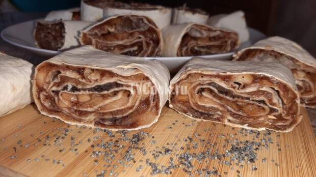 Рулет из лаваша с яблоком, корицей и маком – отличное осеннее лакомство. Сочный, вкусный и полезный десерт. Ингредиенты лаваш тонкий 2 листа; яблоки 8 шт.; сахар 5 ст.л.; крахмал 1 ст.л.; мак 2 ст.л.; корица 1 ст.л.; вода 50 мл. Приготовление: 1 Видео-рецепт приготовления. 2 Подготовка ингредиентов. Яблоки чистим, избавляем от сердцевины и режем мелким кубиком.