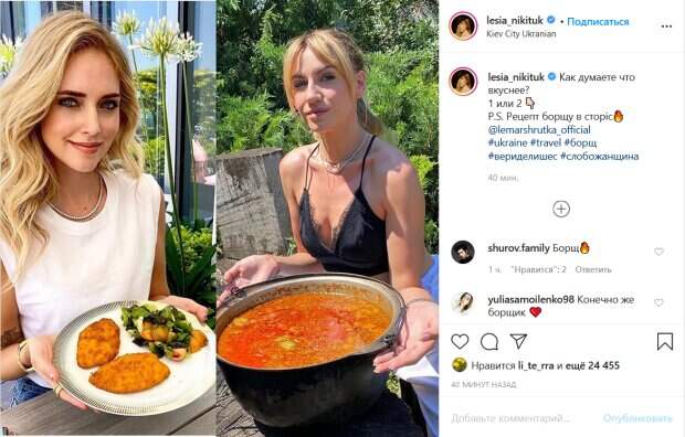 Леся Никитюк решила посоревноваться в хозяйственности с популярной итальянской моделью Известная украинская ведущая похвасталась своим борщом у себя в Инстаграм. Об этом пишет Politeka.net. Так, Леся опубликовала две фотографии и предложила своим подписчикам выбрать на них более вкусное блюдо. На первом снимке позирует популярная итальянская модель Кьяра Ферраньи, которая демонстрирует на камеру котлетки с гарниром.
