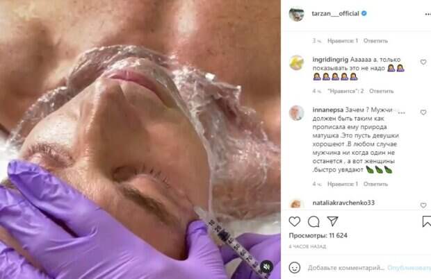 В социальной сети Инстаграм артист без смущения показал, как омолаживает кожу лица и шеи в салоне красоты при помощи уколов и специальных процедур с применением своей крови. «По наставлению моей любимой супруги, теперь тоже посещаю клинику.Сделали несколько самых топовых процедур для лица и шеи, ждём результат» - написал Тарзан. В сети неоднозначно отреагировали на видео мужчины: «Круто, когда есть такая возможность; Как новенький.