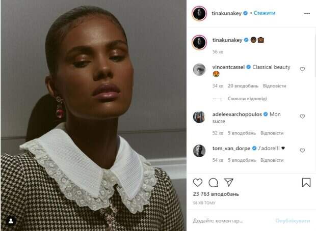 Юная жена 53-летнего актера Венсана Касселя, Тина Кунаки, показала, что ей к лицу не только откровенные образы 23-летняя модель поделилась фотографией, на которой предстала в строгом наряде, передает Politeka.net. На снимке она позирует в черно-белом жакете, поверх которого – белый воротник с кружевом, а под ним видна то ли брошка, то ли кулон в форме креста с зеленым камнем в центре.