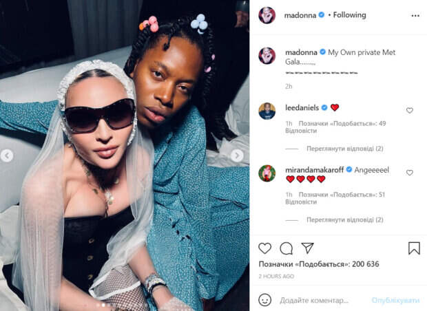 Мадонна, которая и в обычной жизни отличается эпатажностью, пришла на мероприятие в черном корсете, колготках в сеточку и необычной фате, которая держалась на повязке, обвязанной вокруг подбородка певицы. При этом лицо артистки выглядело максимально неестественно. Скрыть следы хирургического вмешательства у Мадонны не получилось. На свежих фото она позировала со знаменитыми друзьями. «Мой личный Met Gala», - подписала фото звезда. В комментариях ей оставили массу приятных слов. Не обошлось и без критики. «Не узнать, так сильно себя перекроила», «Ангел», «Очень смело», «Выглядишь молодо», «Такая красивая», - пишут пользователи сети. Напомним, что Мадонна наплевала на возраст, появившись на публике в прозрачном платье: «Тебе снова 30?». Как сообщала Politeka, Мадонна удивила внешностью без морщин с большими губами: "Пытается быть молодой". Также Politeka писала, что Мадонна с огромными губами ошеломила внешностью 20-летней девочки: «Что с лицом?».