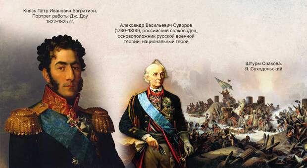 Славные предки Дворянство в Российской империи — привилегированное сословие и опора царской власти и армии. Среди крупных военачальников недворян не найти. Но Багратион — не просто дворянин. Он аристократ высшей пробы. Его род известен с первого века нашей эры. Ещё не появилась Древняя Русь, а Багратионы — уже были. Есть несколько легендарных версий их происхождения. Одна гласит, что Багратионы — потомки персидских сатрапов, другая — что родоначальником был состоятельный еврейский купец, живший в пятом веке до нашей эры, третья — что предки Багратионов упоминаются аж в Библии. Князь — это вообще некоторое понижение в статусе. Предки прославленного русского генерала сами были царями. Баграт III — первый царь единой Грузии, правил всей страной с 1008 года. На престоле сидел и прадед Петра Ивановича Иессе — царь Картли. Один из его сыновей, Александр, из-за разногласий с родственниками переехал в Россию. За ним последовала и семья. Александр перешёл на русскую службу и обосновался в окрестностях Кизляра. Всё это происходило в середине XVIII века, то есть ещё до присоединения Грузии к России. Пётр Иванович, внук Александра, родился приблизительно в 1765 году. Точная дата неизвестна. Биографы Багратиона спорят о ней до сих пор. Диапазон предположений — промежуток между 1762 и 1769 годами. Ученик Суворова Дед и отец Багратиона служили в российской армии, но не достигли высоких чинов. Дворянами они, безусловно, считались, но каким бы древним ни был их род, в России претендовать на положение высшей аристократии семья не могла. Пётр Иванович не получил даже должного для своего сословия образования. Известно, что по-французски он говорил, но плохо, а немецкого не знал вовсе. Протекции у юного Багратиона тоже не было. Иными словами, он не принадлежал к числу тех счастливых юнцов, которые к тридцати годам становились генералами. Тем не менее в генерал-майоры Багратион был произведён в 1799 году. Официально ему тогда исполнилось 34 года. Отсутствие связей Багратион с лихвой компенсировал личной храбростью, умом и способностью быстро учиться. Воевал он много, от пуль не прятался, был любим солдатами и уважаем офицерами. Успехи окрыляли. В 1791 г. Багратион одним из первых поднялся на крепостную стену Очакова. Примерно в это же время и состоялось его знакомство с А. В. Суворовым. Великий полководец полюбил кавказского князя сразу, и Багратион в следующие годы постоянно следовал за старшим товарищем во всех его кампаниях. Суворов настоял на том, чтобы Багратион отправился с ним в Швейцарский поход. Там Пётр Иванович блистательно командовал авангардом, совершил множество подвигов при переправе по Чёртову мосту, пару раз выручил армию Суворова в совершенно безвыходных ситуациях, снискав, таким образом, славу, почёт, ордена и лестные отзывы. Так грузинский князь стал всероссийской знаменитостью. Светский лев Высший петербургский свет всерьёз заинтересовался Багратионом. Князь стал завсегдатаем балов и маскарадов. Недобрые языки бесконечно судачили о его романах. В конце концов личной жизнью генерала занялся сам император. Павел I организовал брак Багратиона с дочерью графа Скавронского — русского посланника в Италии. Сам дипломат был, вроде как, против, но не спорить же с самим императором. Любопытна и другая деталь: ни жених, ни семья невесты не просили Пав