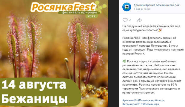 Фестиваль «РосянкаFest», посвященный сохранению природного и культурного наследия Псковской области, состоялся на территории парка «Усадище» в поселке Бежаницы, сообщает 14 августа газета «Сельская новь» Бежаницкого района. Директор Полистовского заповедника Николай Кораблёв на торжественной части праздника объяснил, почему так важно беречь природу.