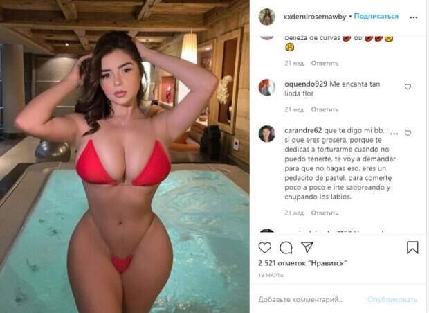 В этот раз модель показала, как проводит время у бассейна в едва заметном бикини не по размеру - подобрав специально бикини размера поменьше, девушка едва скрыла интимные части тела. Дерзкости образу Деми также придает то, что лямки бикини в этот раз совсем прозрачные - тонкие силиконовые ниточки едва держатся на ней. «Почему так мало ткани😂», «Прекрасная ДемиРоуз ... какие фото уфффф такие как солнышко ... жарко», «Превосходно! В мире нет никого лучше Деми 🌹 Роуз, она королева ангелов, моя лучшая любимая прекрасная принцесса Деми 🌹 Роза, я люблю тебя, Деми», «Просто сексуально, конец дискуссии!», «Фантастическое тело, детка, супер за*ница 🔥🔥🔥🔥🔥🔥🔥🔥🔥🔥🔥», «ого боже мой! Очень хороший мед», «Это уже полная нагота, она не оставляет ничего для воображения, жалость к слепым, но вместо этого для нас мужчины с мужским глаголом - это подарок», «Вы - кусок пирога», - пишут пользователи. Также загорелая модель решила поделиться жарким селфи на своей странице в социальной сети Инстаграм. В этот раз девушка показала, как примерила темно-коричневый купальник с тонкими завязками и аккуратными вставками из переплетенных на груди нитей. Длинные локоны Деми предпочла спрятать благодаря специальной укладке и аккуратному украшению с камнями и бусами на ее лбу, а лицо без макияжа не стала подчеркивать дополнительными уходовыми средствами. Как и всегда, главной изюминкой образа Деми стали ее пышные формы. «Зеркало, зеркало на стене...», - загадочно подписала новый кадр Деми. Вот как реагируют поклонники: «Так хорошо 🔥🔥🔥», «😍😍😍❤️Красивая ❤️❤️❤️ Ты такая красивая 💞💞💞💞», «Que hermoso frente», «Кто любит тебя, кроме парня из камары?», «Te vez muy espectacular. Quiero comerte a besos mi vida», «Я не скажу здесь, насколько сильно этот возбуждающий образ вас влияет на мой дух, только если вы спросите», «❤️🔥😍 очень хорошо выглядит». Напомним, Деми Роуз едва удержала пышных «близняшек» в крохотном наряде. Как сообщала Politeka, бесстыжая Деми Роуз сбросила лифчик и показала, как веселится у озера. Также Politeka писала, что влажная Деми Роуз вышла из душа и без стыда блеснула формами