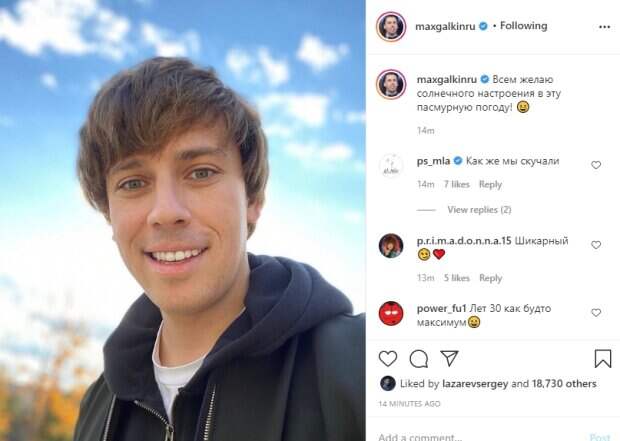 Знаменитый российский телеведущий Максим Галкин, муж Аллы Пугачевой, порадовал новым осенним образом Как сообщает Politeka.net, артист разместил на своей странице в соцсети "Инстаграм" селфи, которое успел сделать во время прогулки. На фото он позирует в черной куртке и толстовке с капюшоном, под которой можно различить белую футболку.