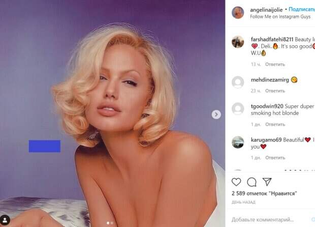 Судя по кадрам, они были сделаны на рассвете карьеры актрисы. На фото видны ее впечатляющие формы – аппетитная грудь и стройные ножки. Лицо Джоли с белыми волосами и популярной укладкой выглядит очень соблазнительно. Особой перчинки фото придает дерзкий взгляд красотки. «Блондинка Анджелина», - коротко подписали фото авторы аккаунта. Пикантный образ Анджелины вызвал бурю эмоций у ее поклонников. В комментариях оставили массу приятных отзывов о ее внешности. «Мэрилин Монро нашего времени», «Прекрасная красота», «Супер пупер огненная горячая блондинка», «Красиво, я люблю тебя», «Какая красота», «Великолепное фото», «Таким образом, она пробуждает добрые чувства таким очарованием, красотой и все еще чувственностью, не имеющей себе равных», «Позволь мне мечтать и фантазировать с тобой», - пишут пользователи сети. Напомним, что звезда «Великолепного века» переборщила с уколами, став двойником Анджелины Джоли: как выглядит актриса. Как сообщала Politeka, страстная Анджелина Джоли спустила штанишки, засветив больше, чем хотела: «Форма впечатляет». Также Politeka писала, что странная дочь Анджелины Джоли сбрила волосы, ошеломив рождественским перевоплощением: как сейчас выглядит Шайло.