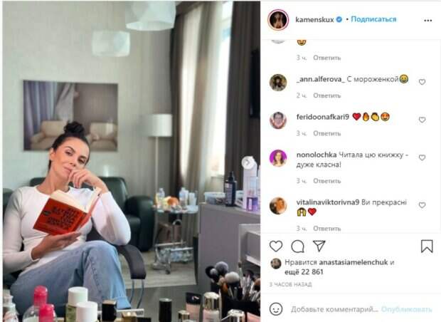 Украинская певица Настя Каменских, которая замужем за рэпером и продюсером Потапом (Алексеем Потапенко), Артистка решила рассказать о своем увлечении, которое помогает ей развиваться и разбавляет будни в перерывах между концертами. В этот раз певица показала себя в домашнем образе с книжкой в руках перед зеркалом с множеством косметики.