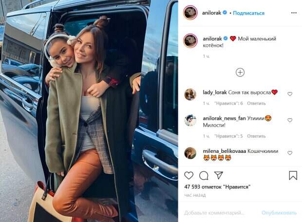 net. На фото Лорак выходит из машины, а ее 9-летняя дочь трогательно обнимает маму сзади. При этом они обе счастливо улыбаются. «Мой маленький котёнок!», - эмоционально подписала снимок певица. Ее поклонники активно комментируют фото. «Наши любимые. Очень люблю ваши фотографии с Сонечкой! Невероятно красивые…», «Шикарного вам вечера», «Какие красивые девочки! Больше становитесь друг на друга похожи», «Две сестренки-подружки», «Такие маленькие, милые, Сонечка похожа на вас», «Софочка, лапочка, а мама Богиня», «Наши принцессы», «Сонечка уже такая взрослая, копия мамы», - пишут люди. Ранее мы писали, что в Сеть попало пикантное фото 42-летней певицы Ани Лорак с любовником, 28-летним продюсером Егором Глебом. На одной из фан-страниц артистки в Инстаграм опубликовали компромитирующий черно-белый снимок. В кадре Егор жарко обнял возлюбленную и поцеловал в губы. При этом молодой человек отпустил непозволительный жест, показав средние пальцы. Каролина подогрела интерес публики своим внешним видом: певица была в коротком топе и приспущенной кофте. При этом сложилось впечатление, судя по предательски выпирающим округлостям, что она была без штанов. Напомним, Ани Лорак возмутила неприличными утехами с любовником, моложе ее на 14 лет. Как сообщала Politeka, отфотошопленная до блеска Ани Лорак удивила внешностью, трудно узнать. Также Politeka писала, что сияющая Ани Лорак в цветах сообщила радостную новость, Каменских не сдержалась.