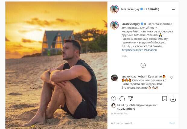 Известный российский певец Сергей Лазарев, которому приписывают отношения с Ани Лорак, поделился впечатлениями из заграничного отпуска Как пишет Politeka.net, исполнитель опубликовал на своей странице в "Инстаграм" новое фото, сделанное на пляже. Он вышел на вечернюю прогулку в черной футболке и коротких шортах, сел на песок и обхватил колени руками.