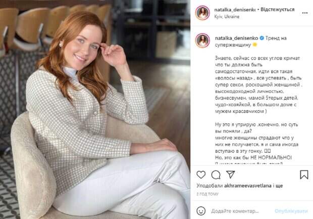 Так, недавно красотка публиковала в сторис кадры с веселой вечеринки с подругами и кумовьями, среди которых была и Ксения, которая только что вернулась из съемок в Хорватии. А теперь показала очаровательное фото, в подписи к которому обратилась к украинским женщинам. На новом снимке Наталка запечатлена в интересной локации, она присела в кресло и мило позирует, поражая свежим видом. Перед камерой красотка появилась в стильных белых брюках и светлом клетчатом пиджаке с перламутровыми пуговицами. Волосы актрисы распущены и аккуратно уложены, а на лице нет макияжа, только очаровательная улыбка, она смотрит прямо в камеру. В подписи к фотографии Денисенко заговорила о суперженщинах. "Многие женщины страдают что у них не получается, я и сама иногда вступаю в эту гонку. Но, это как бы НЕ НОРМАЛЬНО! Я имею в виду не быть такой супервуман, а пытаться БЫТЬ какой-то! То есть НЕ собой! Есть же и тренд на «женщину мать» и «независимую одиночку». Но только дело в том, что женщины мечутся из угла в угол пытаясь соответствовать какой-то картинке. А я думаю, надо просто РЕАЛЬНО признаться себе; как ты хочешь жить! и БЫТЬ той, КАКОЙ ТЫ ЕСТЬ НА САМОМ ДЕЛЕ!", - написала актриса, обращаясь к украинкам. Напомним, звезда сериала "Крепостная" Наталка Денисенко приспустила кофту, подразнив пикантным видом: "Просто прелесть". Как сообщала Politeka, звезда сериала "Крепостная" Наталка Денисенко приспустила кофту, подразнив пикантным видом: «Просто прелесть». Также Politeka писала, что звезда "Крепостной" в пикантной фотосессии раскрыла все секреты, красавчик Цымбалюк не выдержал: "А с кем это ты?".