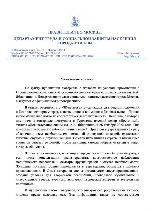 В прошлом году артистка попала в НИИ «Склифосовского», после чего по заверению Гильдии актеров была переведена в Дом Ветеранов сцены. Полный текст опровержения выглядит следующим образом: «По факту публикации материала о жалобах на условия проживания в Геронтологическом центре «Восточный» филиале «Дом ветеранов сцены им. А. А. Яблочкиной», Департамент труда и социальной защиты населения города Москвы выступает с официальным опровержением. В статье говорится, что «88-летняя актриса находится в бедном положении и без должного присмотра», а также лишена внимания и базовых вещей. Данная информация абсолютно не соответствует действительности. Женщина, о которой идет речь в материале, поступила в Геронтологический центр «Восточный» филиал «Дом ветеранов сцены им. А. А. Яблочкиной» 26 декабря 2022 года. Она приехала с небольшим набором личных вещей. При этом в учреждении ее сразу обеспечили всем необходимым: домашней и верхней одеждой, средствами гигиены, обувью и другими вещами. Со слов племянника актрисы, в ближайшее время он отвезет ее домой, чтобы женщина смогла забрать остальные вещи, которые ей нужны. Что касается внимания, то женщине предоставляется необходимый уход, в том числе консультации врача-терапевта, круглосуточное наблюдение медицинского персонала и осмотры других врачей в случае необходимости. Женщина посещает общие мероприятия в учреждении, общается с другими проживающими. В Доме ветеранов сцены организуется досуг проживающих: созданы условия для творческой реализации, проводятся музыкальные и литературные вечера, турниры, выставки, творческие встречи и театральные постановки. В публикации также говорится, что «некровные родственники актрисы лишены права навещать ее». Эта информация также не соответствует действительности. В любом стационарном учреждении запрета на посещение проживающих и общение с ними по телефону нет. С актрисой может встретиться любой человек, однако только при условии ее личного согласия. К женщине уже приезжал племянник, она общалась со знакомыми из гильдии актеров, которые посещали мероприятие в Доме ветеранов сцены имени А. А. Яблочкиной. По словам актрисы, интервью она не давала. Сотрудники учреждения пообщались с женщиной и выяснили, что никаких претензий к условиям проживания и уходу у нее нет. По факту публикации материала о жалобах на условия проживания в Геронтологическом центре «Восточный» филиале «Дом ветеранов сцены им. А. А. Яблочкиной», Департамент труда и социальной защиты населения города Москвы выступает с официальным опровержением. В статье говорится, что «88-летняя актриса находится в бедном положении и без должного присмотра», а также лишена внимания и базовых вещей. Данная информация абсолютно не соответствует действительности. Женщина, о которой идет речь в материале, поступила в Геронтологический центр «Восточный» филиал «Дом ветеранов сцены им. А. А. Яблочкиной» 26 декабря 2022 года. Она приехала с небольшим набором личных вещей. При этом в учреждении ее сразу обеспечили всем необходимым: домашней и верхней одеждой, средствами гигиены, обувью и другими вещами. Со слов племянника актрисы, в ближайшее время он отвезет ее домой, чтобы женщина смогла забрать остальные вещи, которые ей нужны. Что касается внимания, то женщине предоставляется необходимый уход, в то