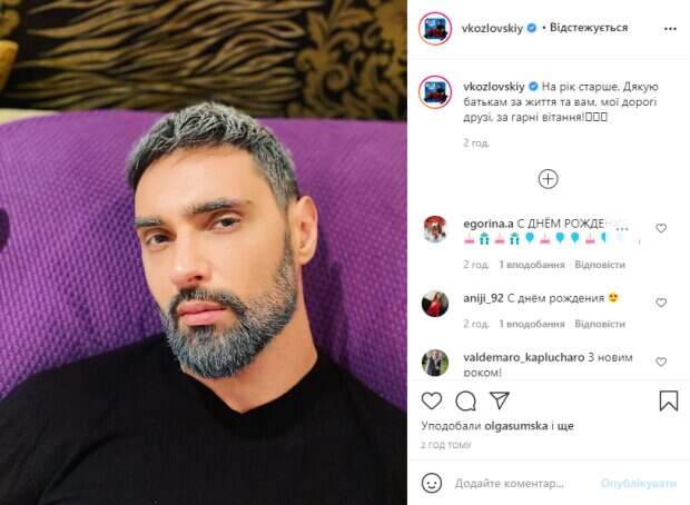 Украинский исполнитель Виталий Козловский показал странное фото с сединой в свой день рождения Как сообщает Politeka.net, известный украинский исполнитель Виталий Козловский не перестает удивлять публику экстравагантными образами и удивительными экспериментами в творчестве и жизни. Бородатый красавчик активный пользователь Instagram, где часто радует поклонников яркими фото и видео.