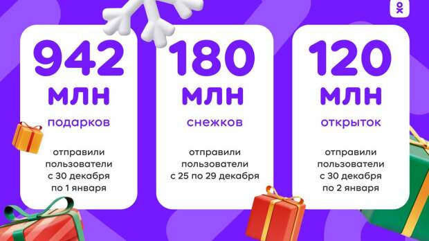 За три дня, с 30 декабря по 1 января, пользователи «Одноклассников» отправили друг другу 942 миллиона подарков. Лидером по количеству отправленных подарков среди российских регионов стала Москва, а самым щедрым на виртуальные...