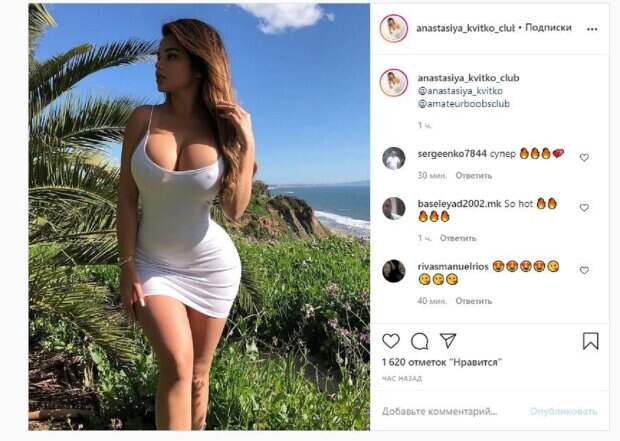 Известная модель Анастасия Квитко, которую называют русской Кардашьян, показала себя в зажигательном образе На фото звезда позирует в белом тоненьком платье, которое практически ничего не скрыло. Анастасия оставила волосы распущенными, взявшись за них одной рукой. Квитко соблазнительно выгнулась и без стыда демонстрировала пышный бюст, который прямо выпирал из наряда и можно увидеть торчащую красоту.